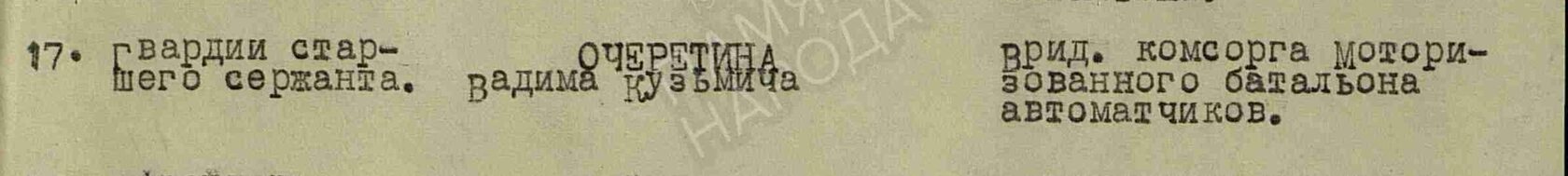 Вадим Очеретин просился на фронт с первых дней - его не отпускали, потому что заменить "дипломированного" застановщика женщиной или подростком было невозможно, а завод выполнял оборонные заказы. В начале 1943 года объявили набор в Уральский добровольческий танковый корпус, и Очеретин подает заявление. В составе 10-го гвардейского Уральского добровольческого танкового корпуса, прославившегося в боях на Курской дуге и в других сражениях, пережив три ранения, Вадим Кузьмич Очеретин доехал на броне танка Т-34 до Берлина и завершил войну в Праге.